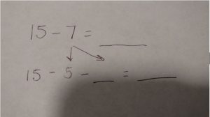 The student was stumped. He did not understand what the arrows were for, or why the 7 was suddenly a 5. I quickly explained to him that it is far easier to take 5 away from 15 than it is to take away 7. He agreed with me, but then he became stuck when I asked him how much more still needed to be taken away. He wanted to tell me that 3 and 4 make 7, but he had no reference for what would make 7 with a 5 involved. Fingers became involved, and we discovered that he still needed to take away 2 more. Thus, he eventually got to the answer of 8.